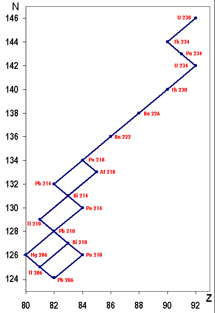 Schema di decadimento della famiglia dell'uranio, presentata sopra in forma tabulare, in un diagramma Z - N (Z: numero protoni; N: numero di neutroni). Il valore a fianco del simbolo atomico, in rosso, rappresenta pertanto la somma dei protoni e dei neutroni, cioè la massa atomica.